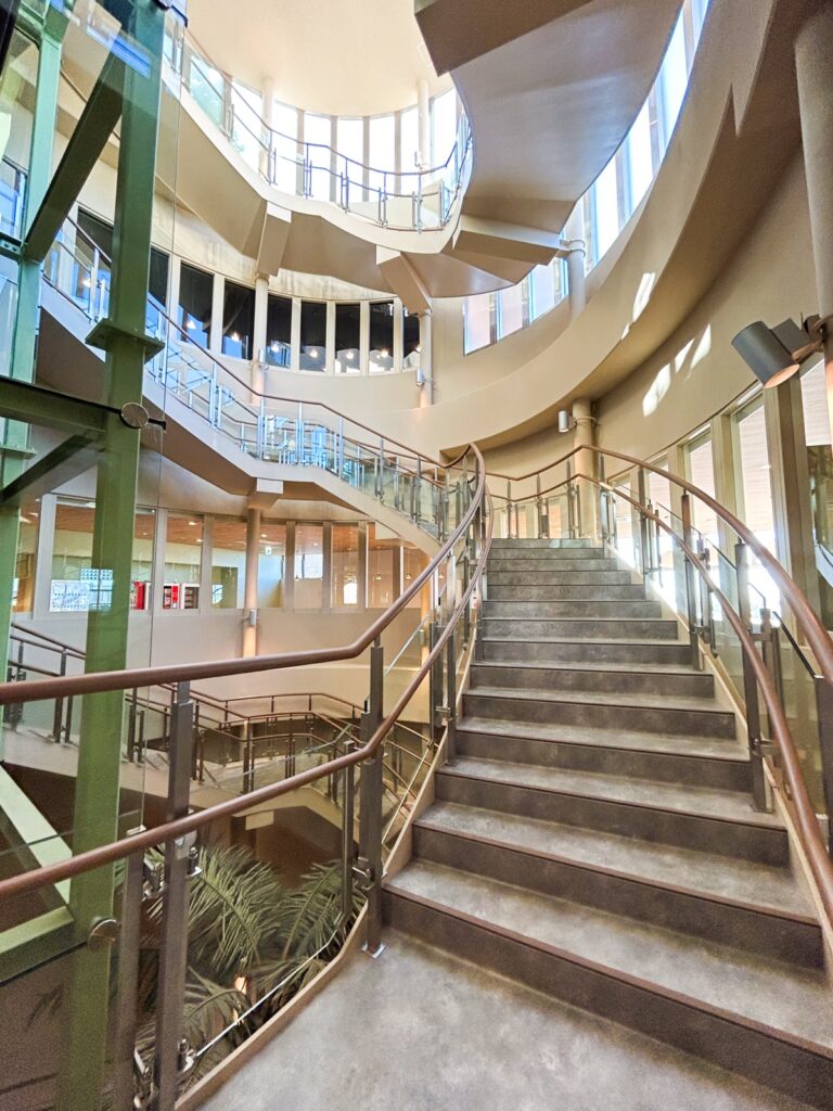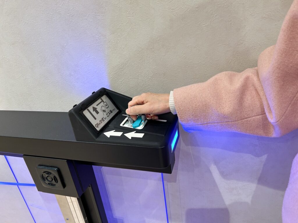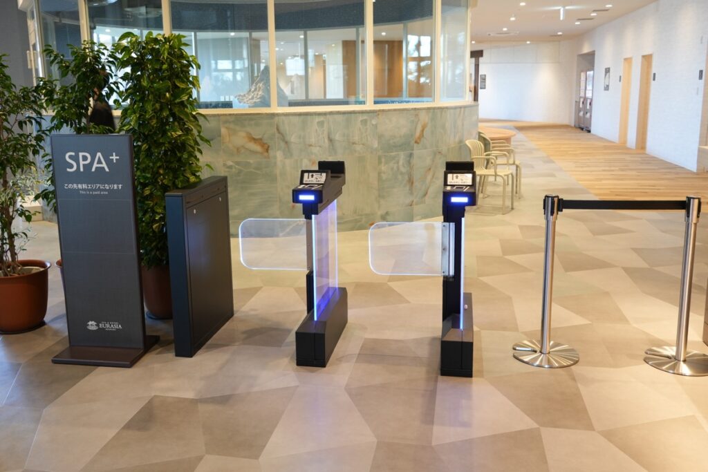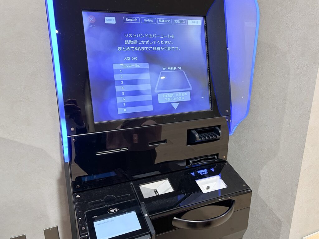 お帰りは、3階のエントランスへ戻ります。ここでもリストバンドのQRコードを使った自動精算機が設置されていて、スムーズにチェックアウトすることができます。
