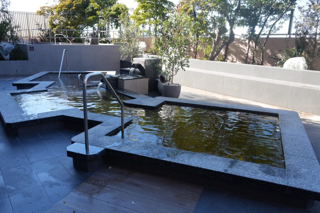 水深1m、60cm、50cmという深さの違う3つの浴槽があり、全身浴と半身浴を楽しめます。