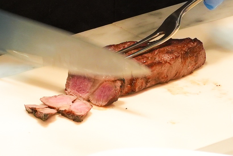 430℃の石窯で焼き上げた特選牛ロースのステーキは、表面が香ばしく焼き上がっていて、中はジューシーです。