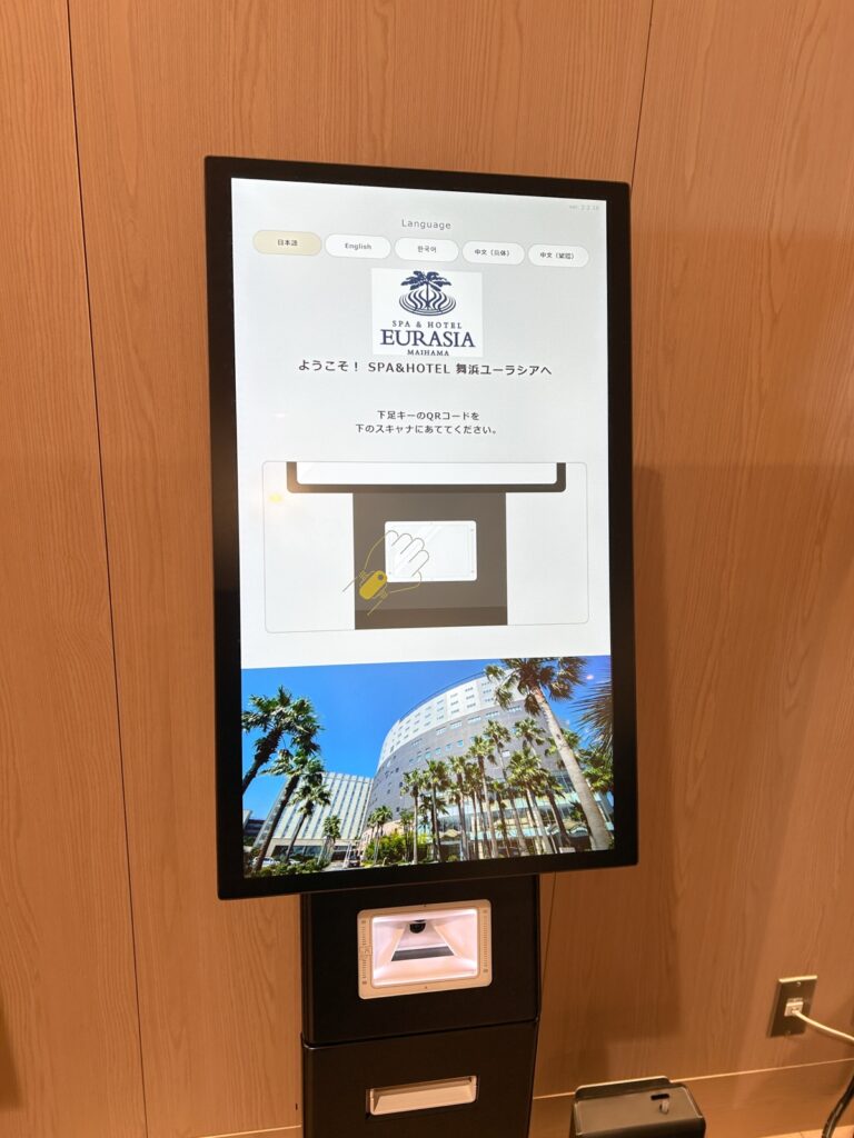 チェックインは、自動機を使うので、スムーズです。リストバンドについているQRコードをかざして使います。