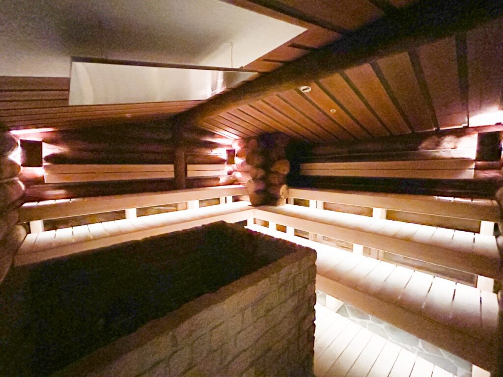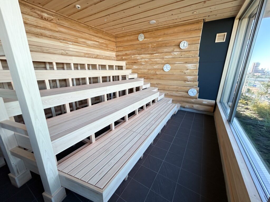 「木の宝石」と呼ばれる希少な木材「ケロ」を使用し、本場のサウナを再現しています。