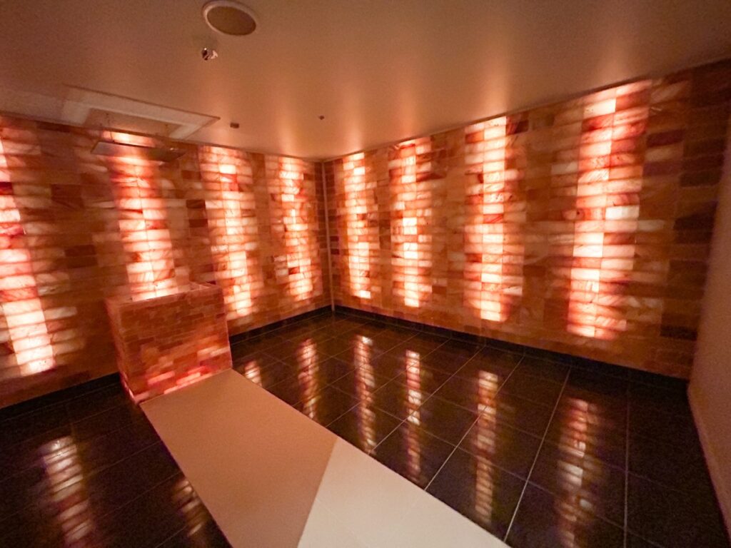 壁面のヒマラヤ岩塩がやさしく発光し、天然ミネラルで身体を芯から温めます。